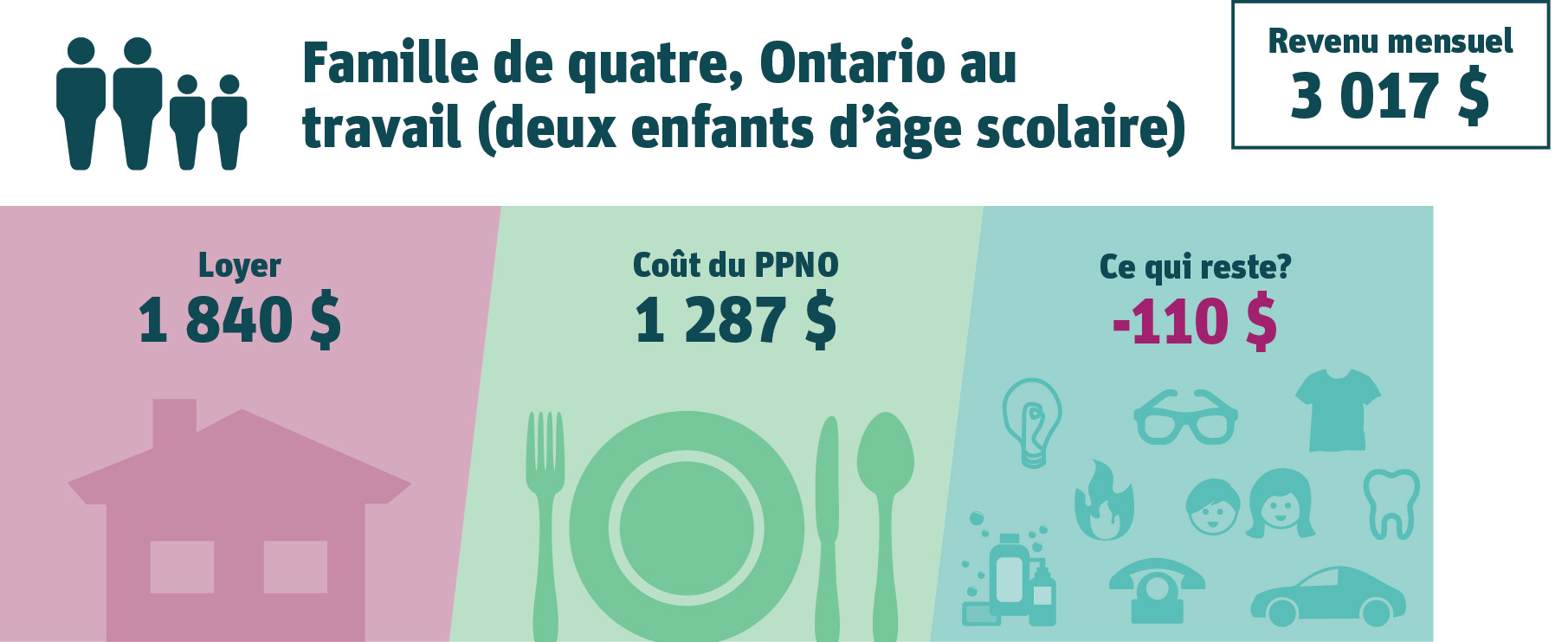 | Famille de quatre, Ontario au travail (deux enfants d’âge scolaire) | 3 017 $ | 1 840 $ (61%) | 1 287 $ (43%) | -110 $ |