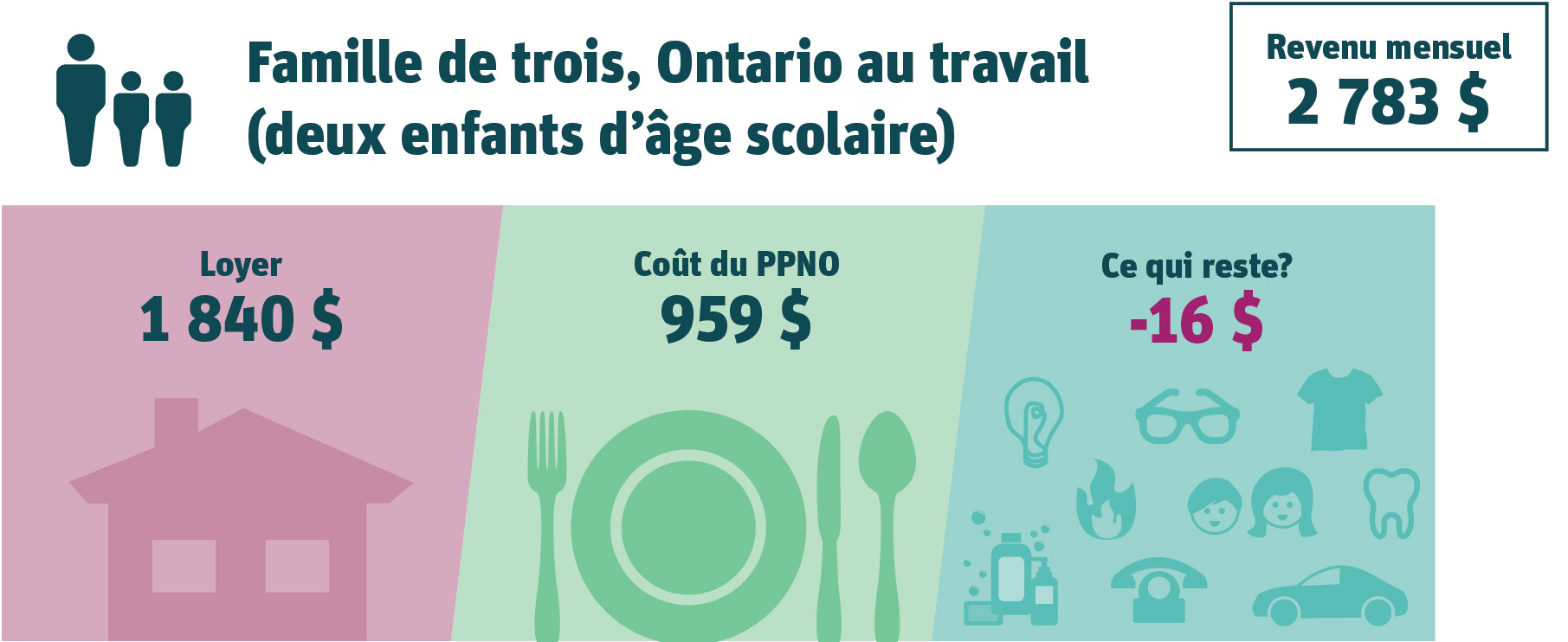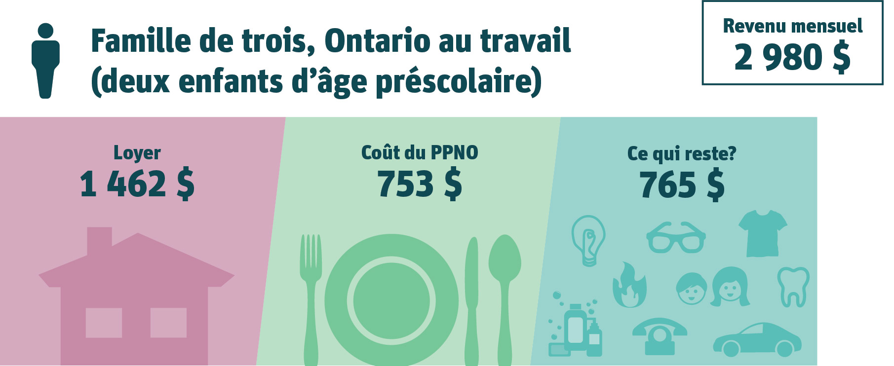 | Famille de trois, Ontario au travail (deux enfants d’âge préscolaire) | 2 980 $ | 1 462 $ (49%) | 753 $ (25%) | 765 $ |