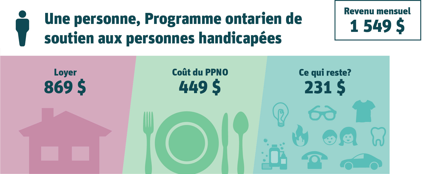 | Une personne, Programme ontarien de soutien aux personnes handicapées | 1 549 $ | 869 $ (56%) | 449 $ (29%) | 231 $ |