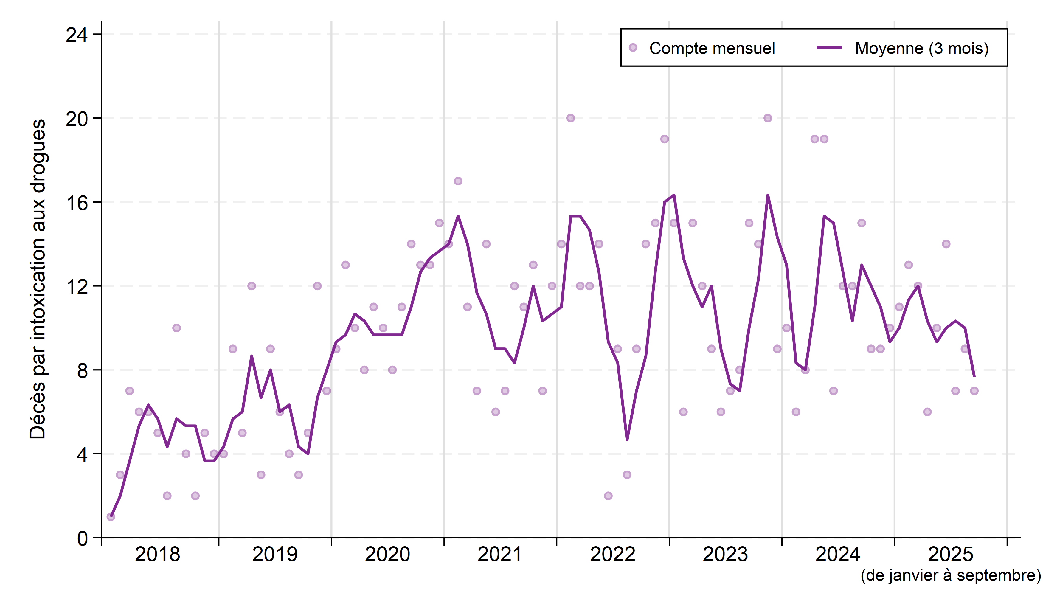 Figure : Décès soupçonnés d’être liés à la toxicité des drogues dans les districts de Sudbury et de Manitoulin, par mois, de 2018 à 2025
