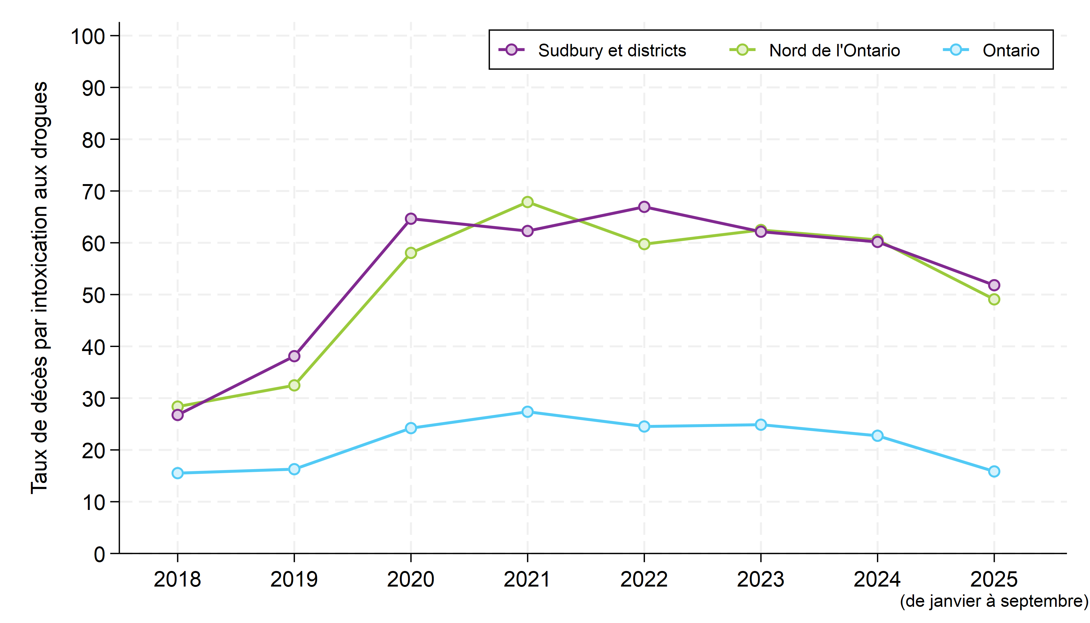 - Les décès sont attribués à des zones géographiques d’après le lieu de l’empoisonnement aux drogues ou, si cette information n’est pas accessible, le lieu du décès. Les nombres de décès dans les districts de Sudbury et de Manitoulin peuvent donc inclure des personnes qui sont mortes ici, mais qui provenaient d’autres zones géographiques. Ces décès généreront une petite erreur dans les taux calculés, dont les dénominateurs sont basés sur des estimations de population locale.