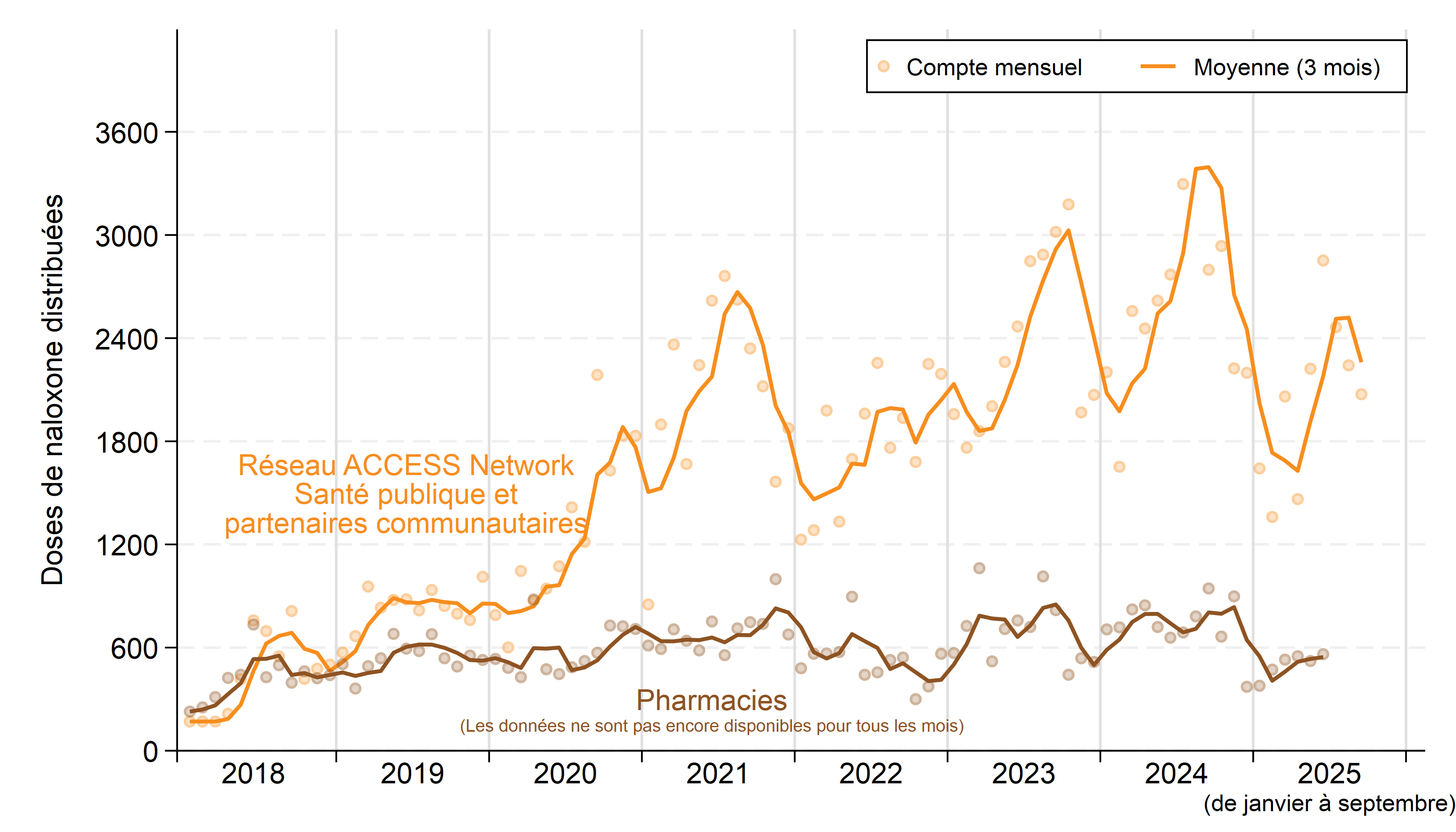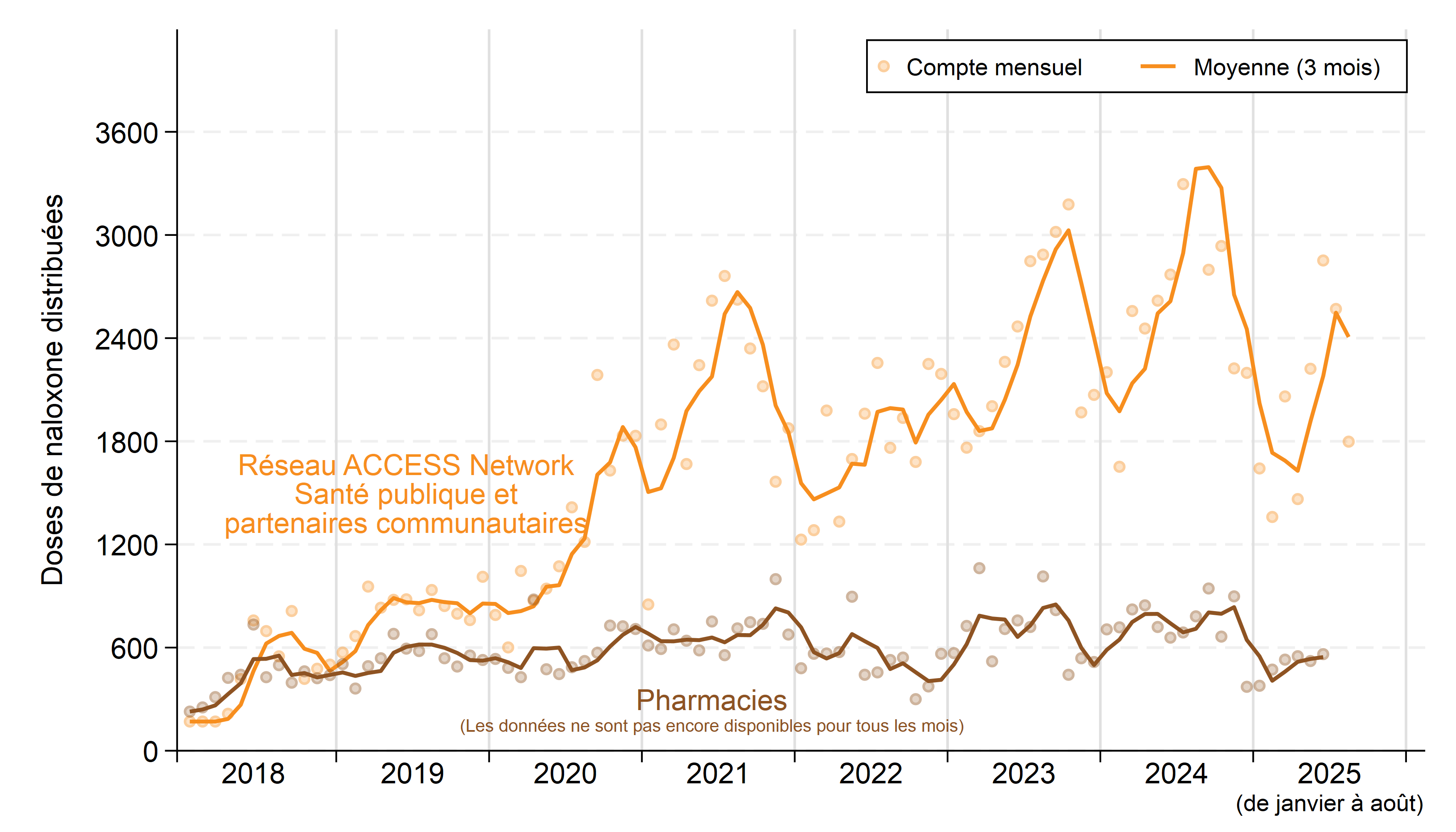Tableau : Doses de naloxone distribuées par le Réseau ACCESS Network, Santé publique et ses partenaires communautaires (à l’exception des pharmacies), par mois, de 2018 à 2025
