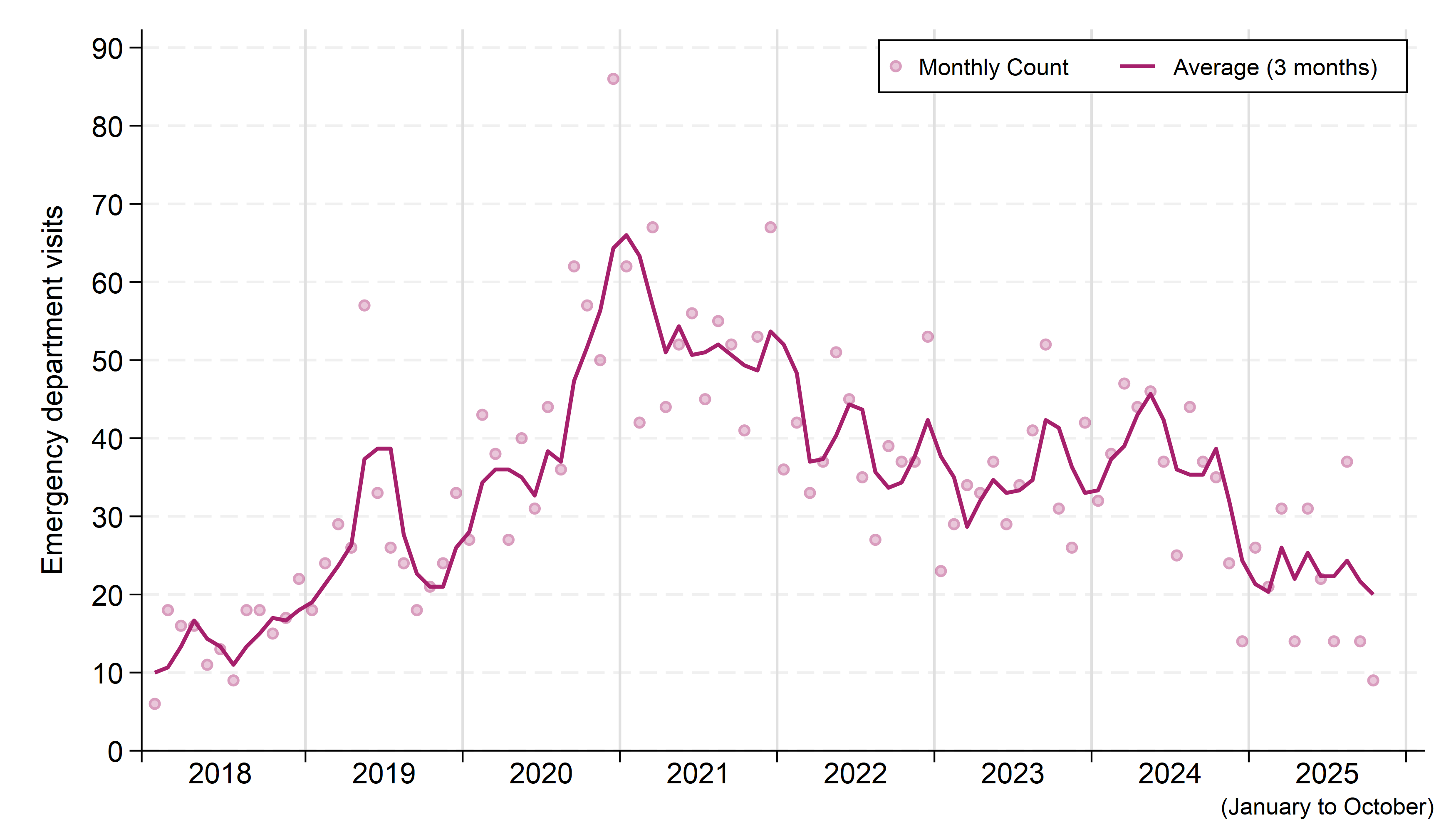 Figure: Emergency department visits for confirmed opioid drug poisonings, by month, Sudbury and Manitoulin districts, 2018–2025