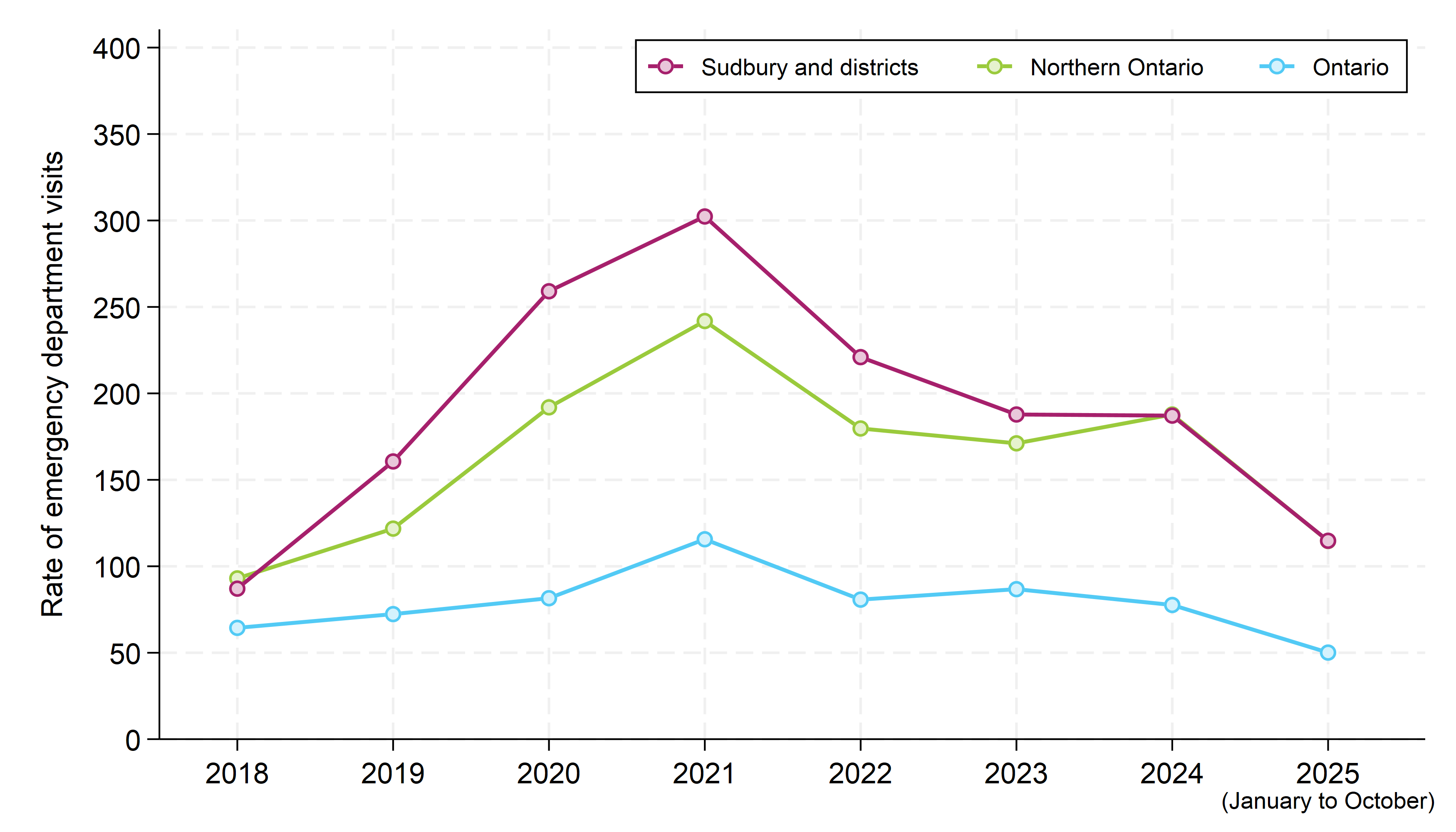 Source: (1) Canadian Institute for Health Information (CIHI), National Ambulatory Care Reporting System (NARCS) [unpublished datafile]. Received from the Ontario Ministry of Health on October 14, 2025. (2) Ontario Ministry of Health, Population Estimates and Projections 2018–2025, IntelliHEALTH Ontario, accessed March 20, 2025.