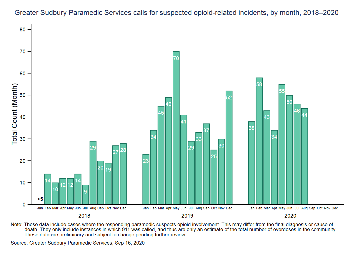 Figure Greater Sudbury Paramedic Services calls for suspected opioid-related incidents by month 2018-2020