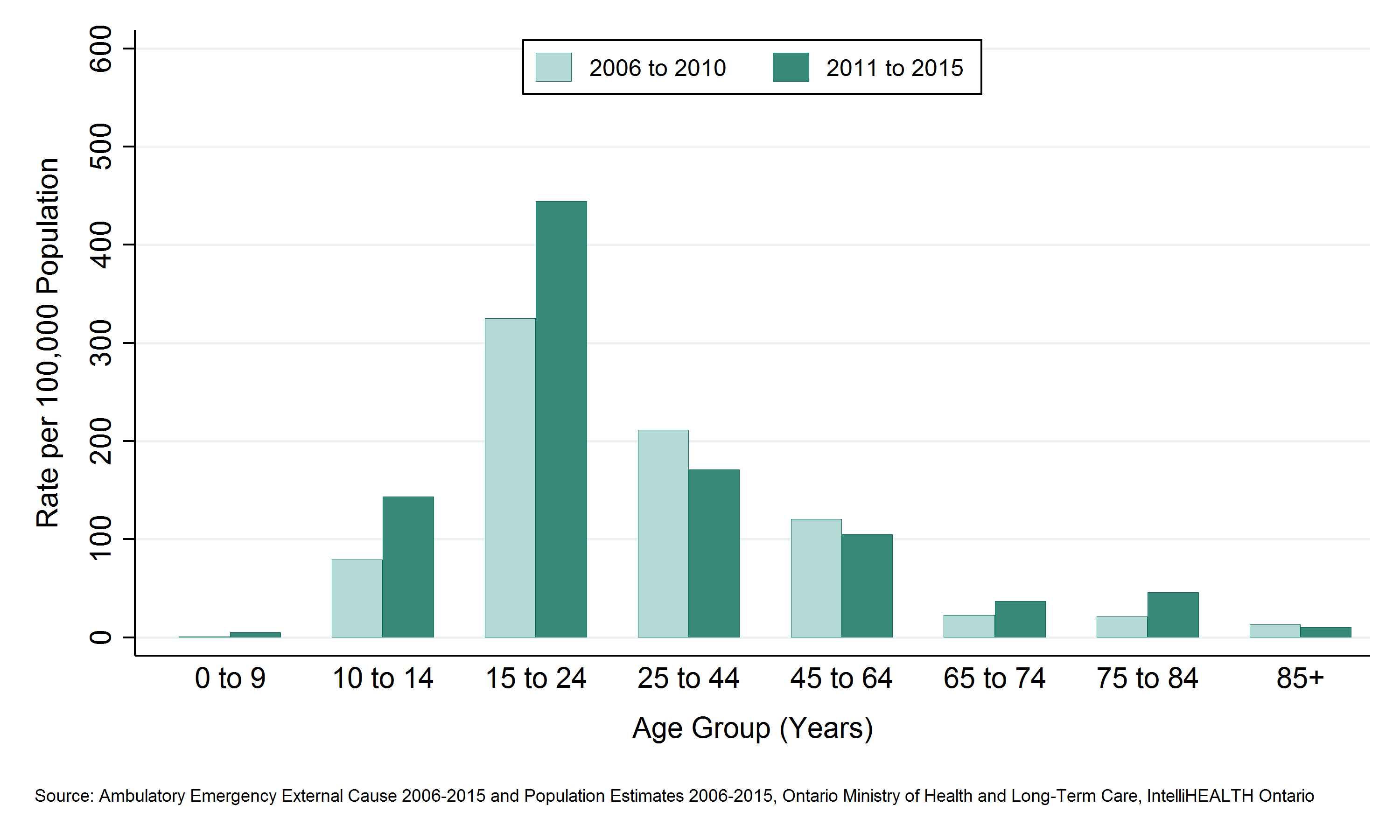 Figure: Annual rate of emergency department visits, intentional self-harm, by age group, SDHU, 2006 to 2010 and 2011 to 2015